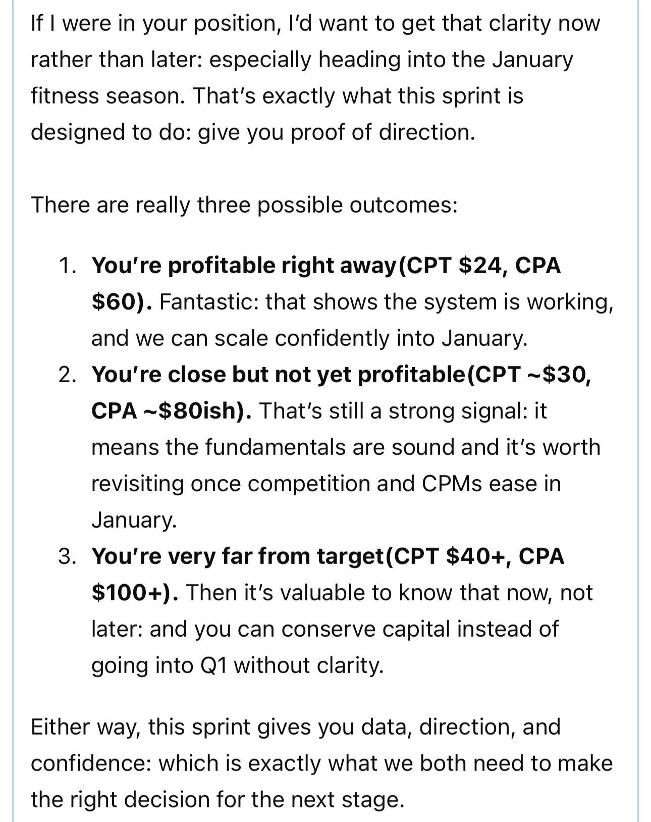 Hey Reader True story. A fitness brand told me last week they're thinking of waiting until January to start testing. And I just... paused. I get it. January is the promised land, right? Everyone's motivated. Credit cards are out. "New Year New Me" is in full effect. But that's exactly the problem. January is GO TIME. The buyers are ready. The intent is through the roof. People are actively looking for what you sell. And if you're still "testing" during all that? You're warming up while...